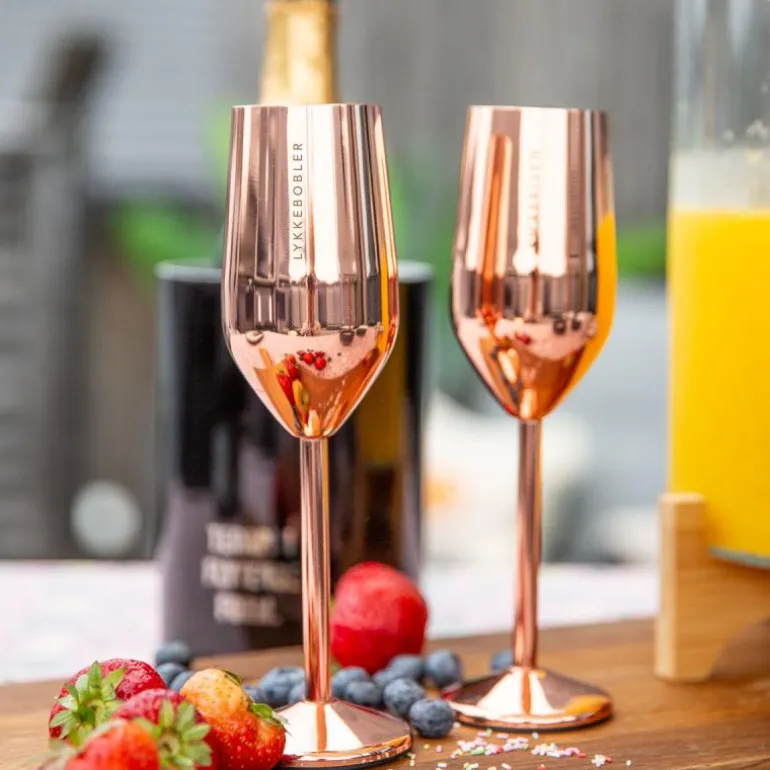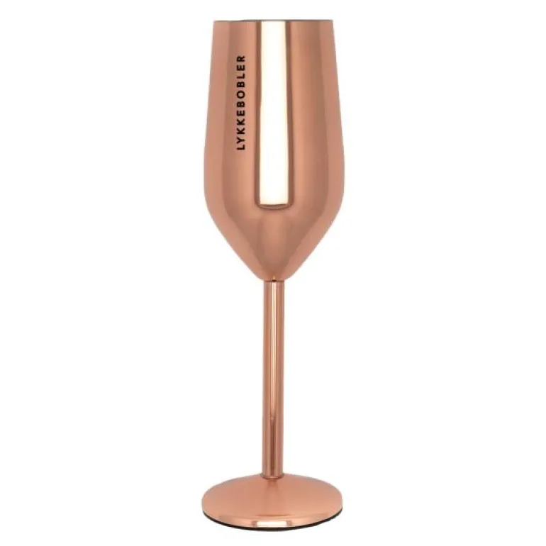 Glasset er laget av rustfritt stål. LYKKEBOBLER champagneglass m/stett har en blank, rosègull farge. Teksten er lasergravert.