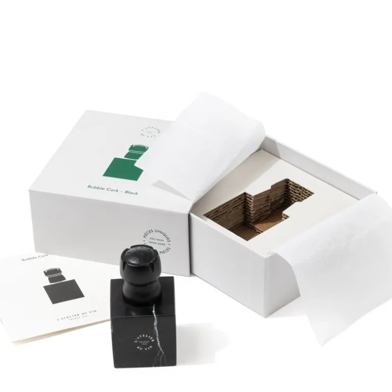 L’Atelier du Vins champagnekorkstopper er en sofistikert propp som ikke bare bevarer boblene, men gjør det med stil. Utformet som en original champagnekork og plassert på en elegant marmorsøyle, sikrer denne stopperen at flasken forblir tett og trykket intakt. Ved bruk, skru proppen til av-posisjon, sett den på flasken, og skru deretter den øvre delen på plass mens du holder den nedre. Fjernes enkelt ved å holde i den nedre delen mens du skrur på den øvre. Et ideelt valg for de som verdsetter godt design og ønsker å nyte musserende vin til siste dråpe.