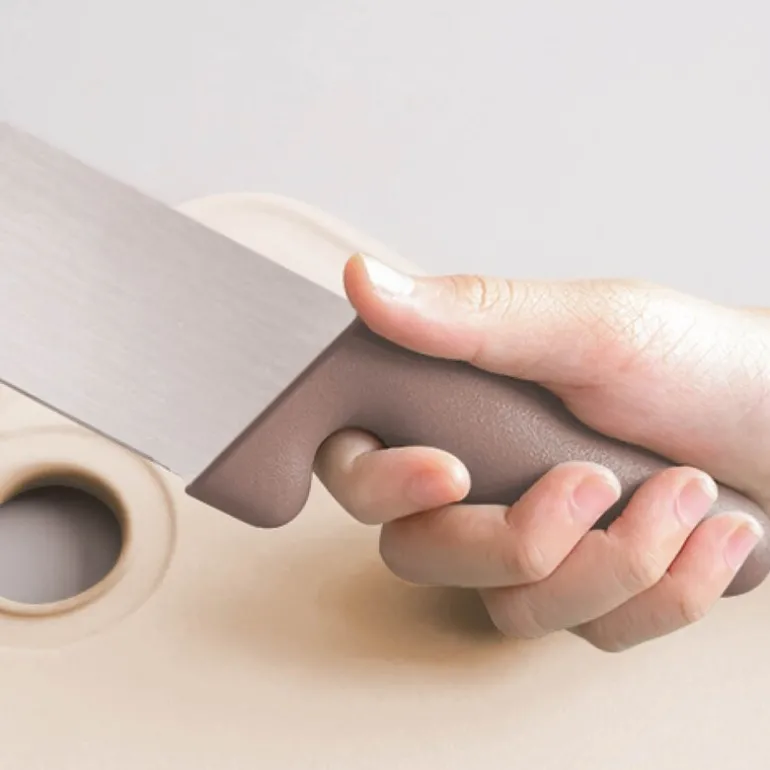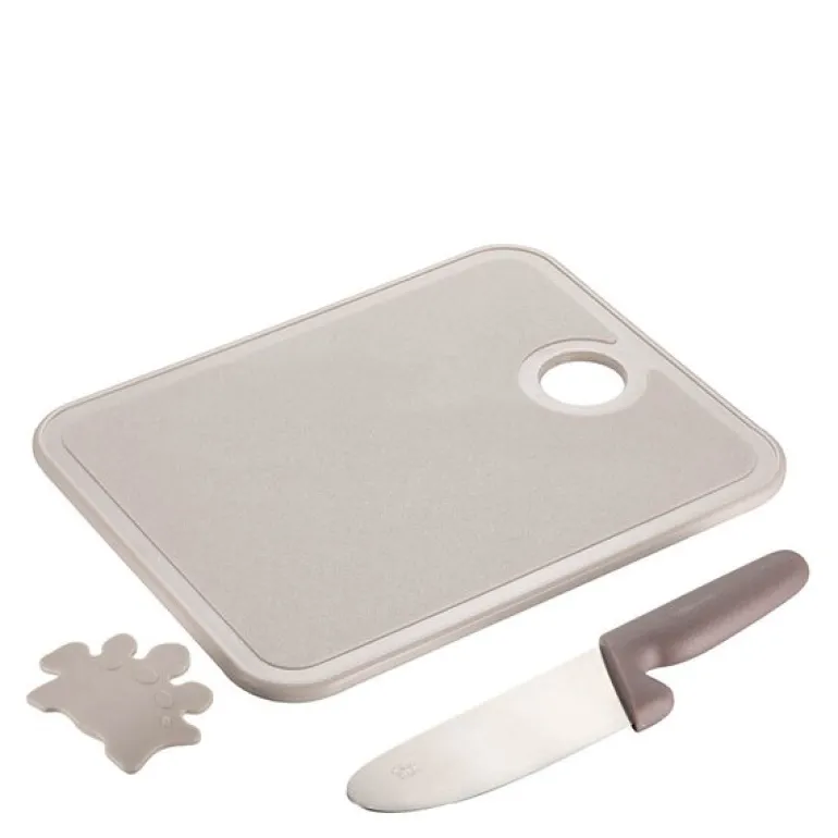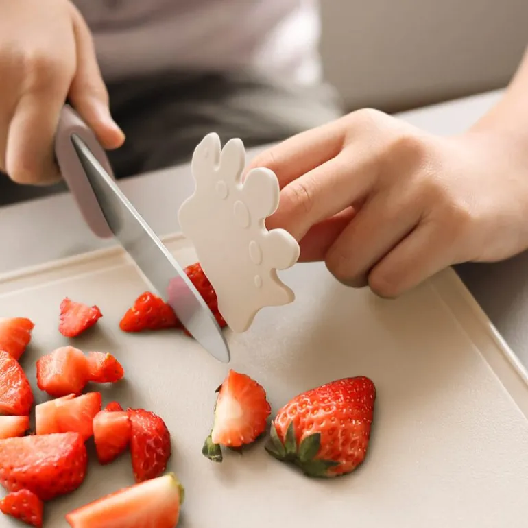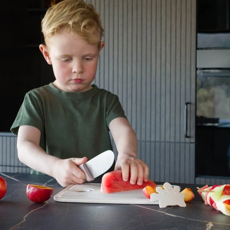 Kniven har avrundet blad og håndbeskyttelse som hindrer glidning, slik at barna kan lære å bruke kniv på en sikker måte. Skjærebrettet har en sklisikker base som holder det stødig på benk og bord.