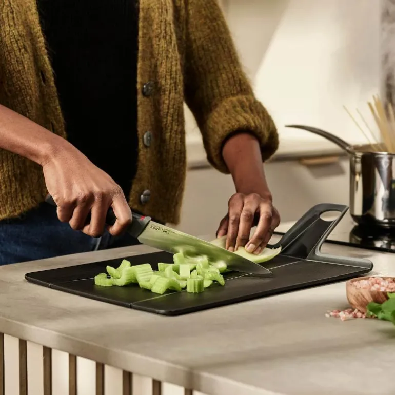 Joseph Josephs Chop2Pot Plus skjærebrett i svart er en praktisk og innovativ løsning for matlagingen din. Denne skjærebrettet er ikke bare slitesterkt og sklisikkert, men det har også en smart funksjon som gjør det enkelt å overføre mat til gryten eller søppelet.