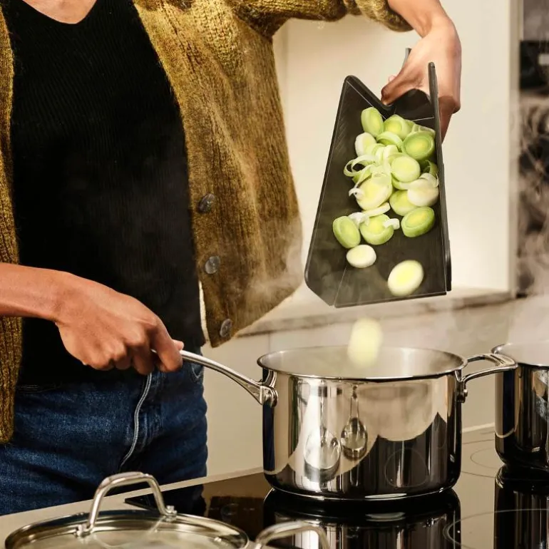 Det svarte skjærebrettet, Chop2Pot Plus, som måler 37,5 x 21,5 cm, er fra Joseph Joseph. Chop2Pot Plus er det originale sammenleggbare skjærebrettet som forenkler matoverføringen. Når det ligger flatt, gir det en knivvennlig og sklisikker skjæreflate egnet for all matlaging. Men når håndtaket klemmes, brettes sidene av brettet opp, og danner en praktisk renne nedover, slik at oppkuttet mat eller avfall pent kan føres ned i gryten eller matavfallet. Kutteområdet er 21,5 x 37,5 cm.