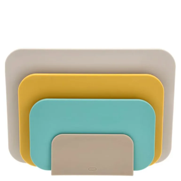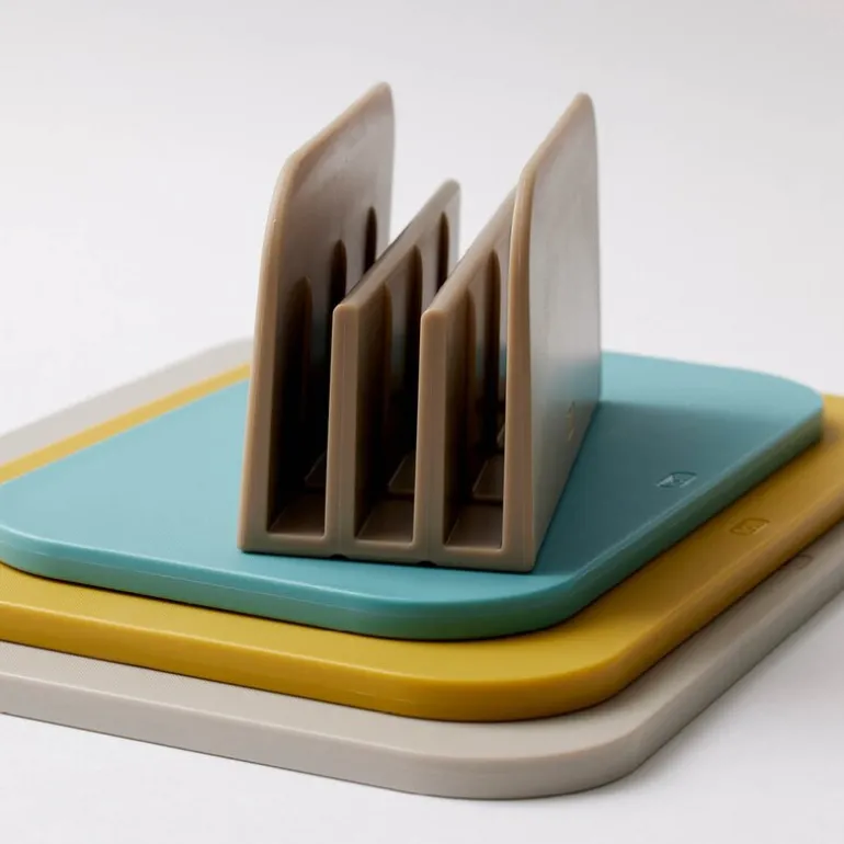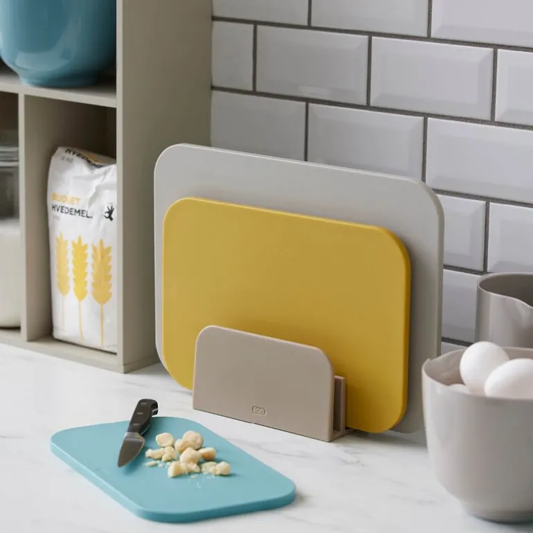 Settet inkluderer en praktisk oppbevaringsholder som gjør det enkelt å holde orden. Holderen er designet for å gi god ventilasjon og hygiene, med riller i bunnen som sikrer at brettene tørker ordentlig hvis de settes på plass fuktige. Skjærebrettene står med litt avstand fra hverandre, noe som gjør det både hygienisk og plassbesparende.