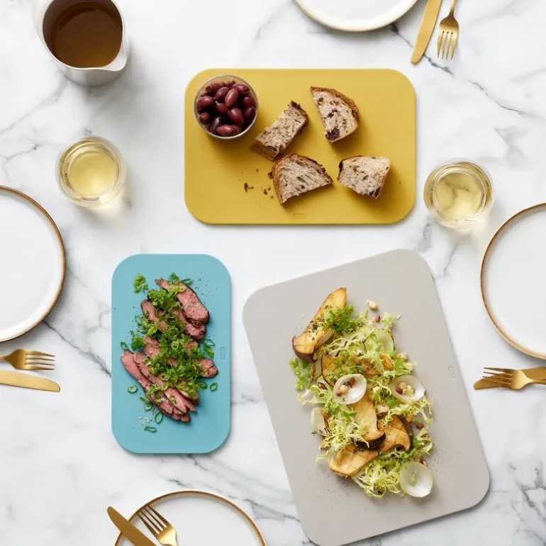 De er ideelle for daglig bruk, enten du skal kutte urter, hakke grønnsaker eller skjære brød. Takket være det gjennomtenkte designet kan skjærebrettene også brukes til servering, og de passer perfekt til å legge frem brød, oster, tapas eller pølser direkte på bordet.