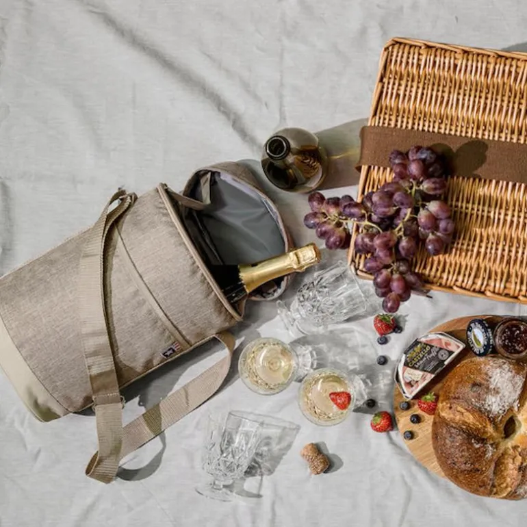 Høy kjøleveske i lin, City, fra Sagaform. En smart kjølebag som er litt høyere, og dermed passer for eksempel for to vinflasker, eller 2 stykk 1,5 liters PET-flasker. Utstyrt med både bærehåndtak og justerbar skulderstropp.
