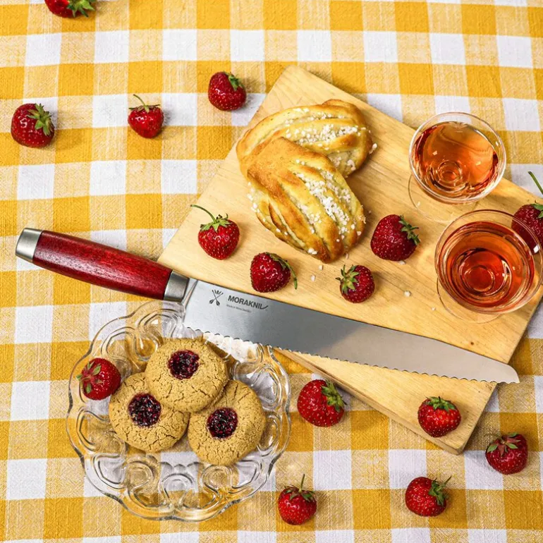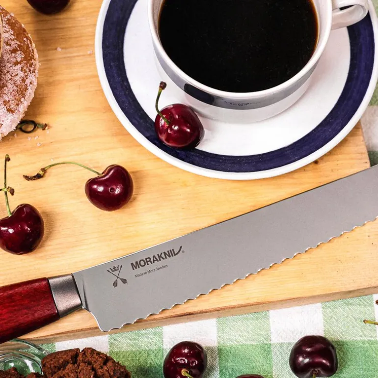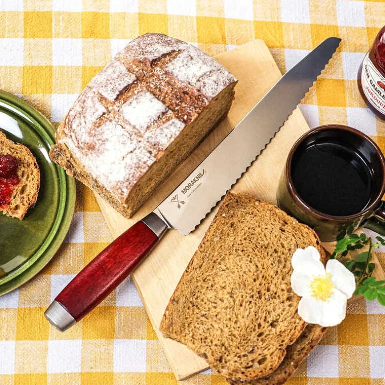 Classic 1891 brødkniv fra Morakniv på 37,1 cm er spesielt laget for å gi deg en optimal skjæreopplevelse, enten du håndterer sprø baguetter, luftige briocher eller saftige surdeigsbrød. Denne brødkniven, en del av den eksklusive Classic 1891-kolleksjonen, er designet for å møte alle behov på kjøkkenet. Med et ergonomisk utformet håndtak i vakkert rødt bjørketre og et tagget knivblad av svensk rustfritt stål, gir den deg både sikkerhet og presisjon når du skjærer brødet ditt i perfekte skiver. Bladet er 24 cm langt og 2,3 mm tykt, noe som gjør det ideelt for både små og store brød.