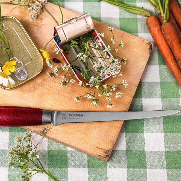 Håndtaket, laget av vakkert rødt skimrende bjørketre, er ergonomisk utformet for å sikre et behagelig grep, mens det smale, 19 cm lange bladet i svensk rustfritt stål gir deg en uovertruffen presisjon. Med en tykkelse på 2,3 mm er bladet fleksibelt nok til å gli jevnt gjennom fisk eller kjøtt, samtidig som det gir en god følelse av kontroll. Denne fleksibiliteten gjør den ideell for å fjerne skinn eller polere bort membraner, noe som gir deg perfekt resultat hver gang.