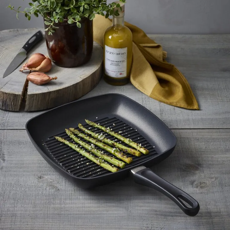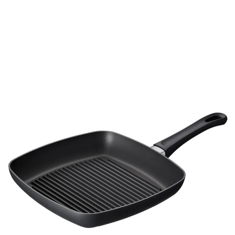 Classic Induction grillpanne 27×27 cm fra Scanpan. Grillpannen har høye, spisse grillribber, noe som gir maten de helt riktige sprø og velsmakende grillstripene. Pannen er en perfekt erstatning for hagegrillen når været er dårlig eller tiden ikke strekker til.