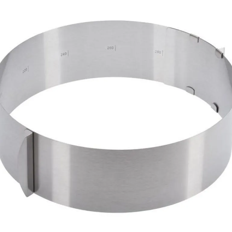 Med denne ekstra høye og justerbare kakeringen kan du enkelt velge både høyde og form på kaken. Du kan bruke kakeringen med bakepapir når du baker kakebaser eller myke kaker, når du lager iskrem eller desserter.Diameteren kan justeres fra 16cm til 30cm og høyden er hele 8,5cm. Praktisk håndtak hjelper deg å justere ringen til rett størrelse.Tåler oppvaskmaskin.5 års garanti.