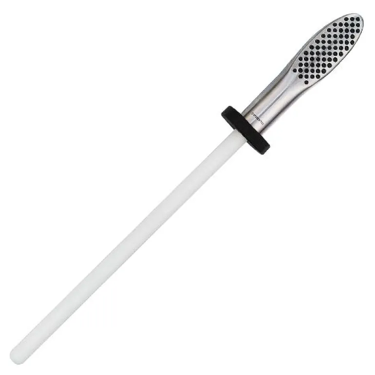 G-74 Classic keramisk slipestav 22 cm fra Global. For å opprettholde et skarpt egg er det nødvendig å slipe kniven med jevne mellomrom. Hold din Global-kniv ved like ved at du én gang i måneden drar kniven over et skjerpestål. Det finnes både keramiske skjerpestål og skjerpestål i diamant. Diamantskjerpestålet er grovere i utførelsen og brukes om nødvendig før det keramiske skjerpestålet.