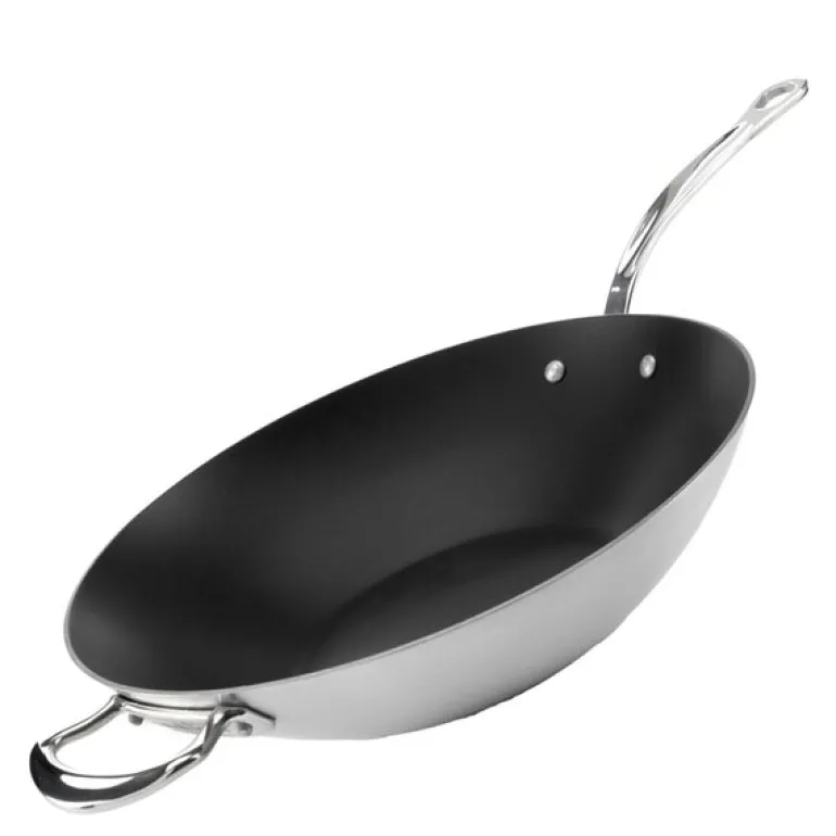 Samuel Groves Classic Non-stick wokpanne 32 cm kombinerer en høyteknologisk konstruksjon med brukervennlig design. Den består av tre lag metall: en effektiv varmeledende aluminiumskjerne og to lag rustfritt stål, noe som gir perfekt varmefordeling og lang levetid.