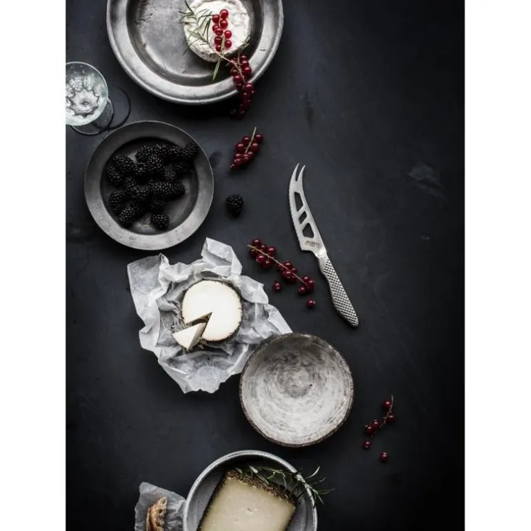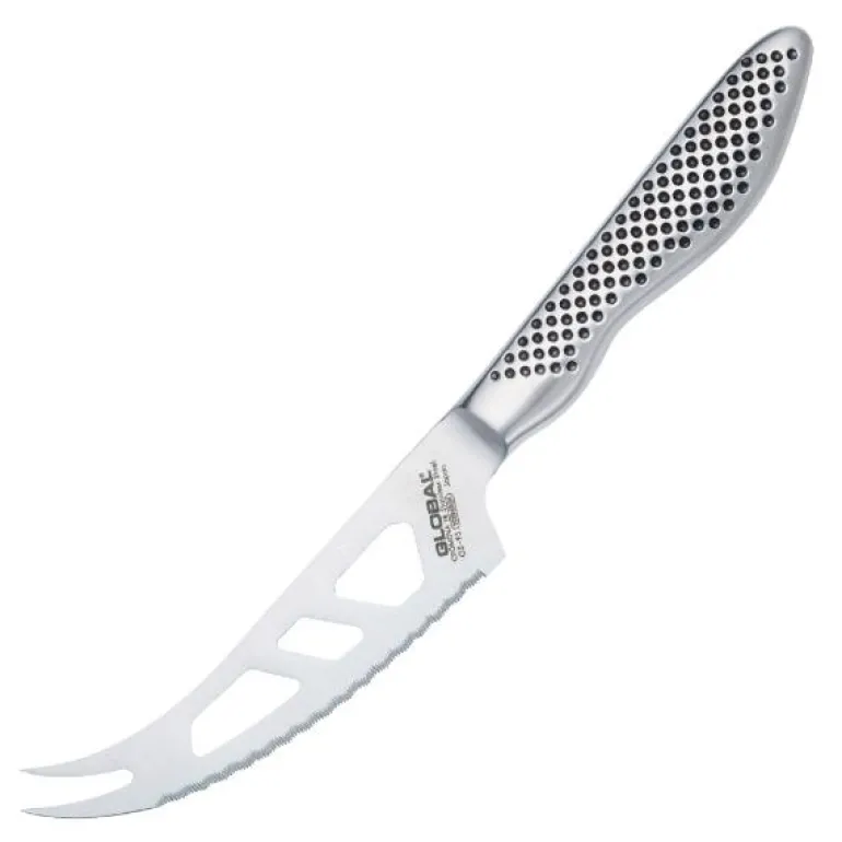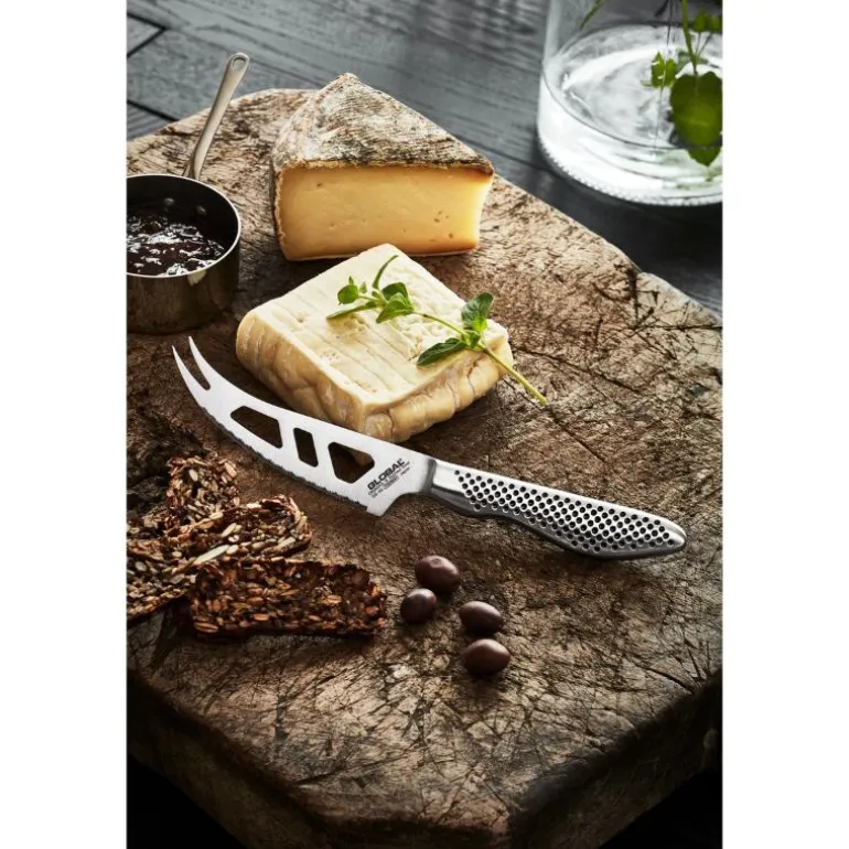 Med Globals ostekniv håndterer du alle typer dessertost. Hullene i knivbladet gjør at du kan skjære myke oster uten at de kleber seg til kniven. Samtidig er tanningen til hjelp når du skjærer harde oster. Kniven har også en todelt spiss, noe som er svært nyttig når du skal flytte ostebitene fra serveringsfatet til tallerkenen.