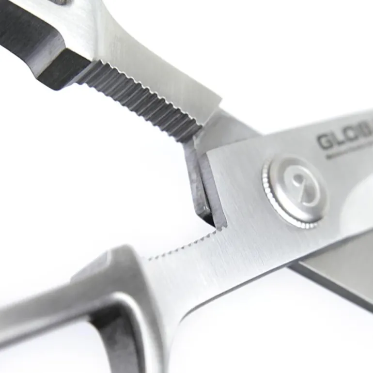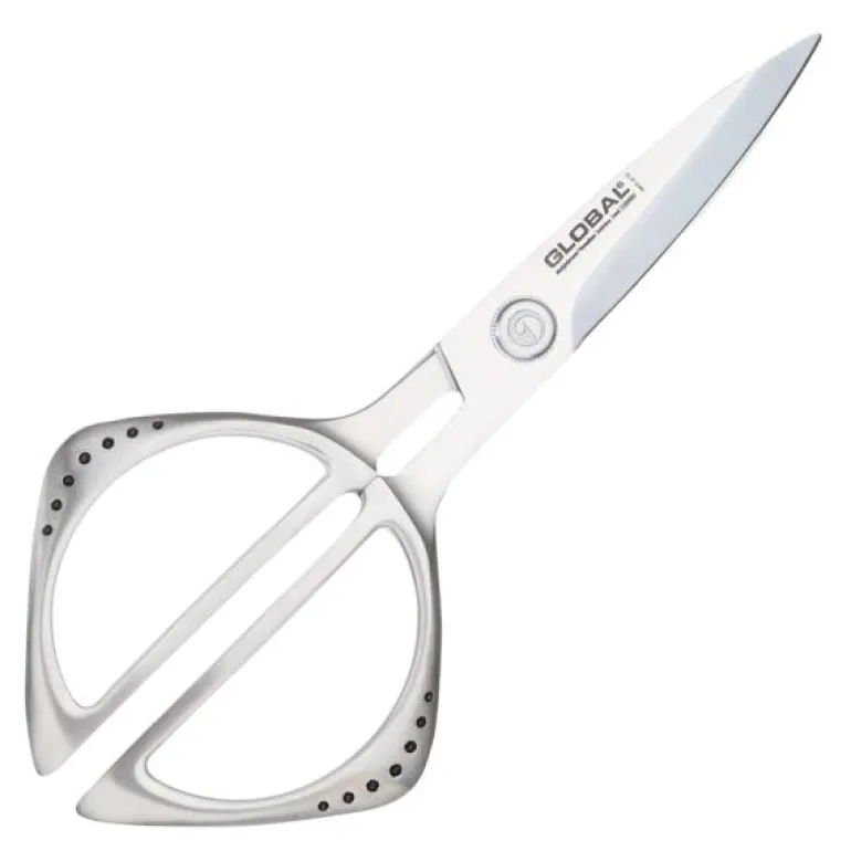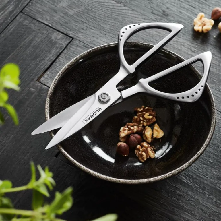 Globals kjøkkensaks er utstyrt med en rekke smarte funksjoner. Den har for eksempel en klo som du kan bruke til å knekke nøtter eller åpne kreps med. Skaftet smalner også inn i en kile som kan hjelpe deg å lirke opp bokser som er vanskelige å åpne. Bladet på saksen har en mikrotannet egg som gir et perfekt snitt når du klipper. Du kan lett justere bladet med en skrue.