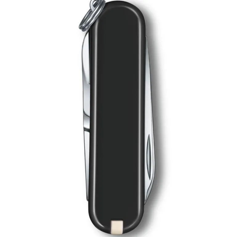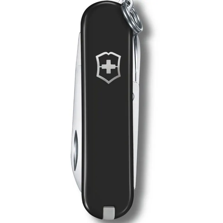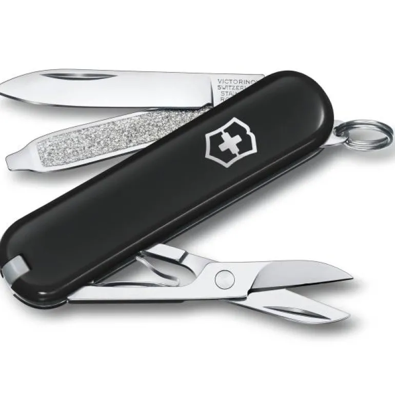 Victorinox lommekniv Classic sort 58mm i gaveeske med 7 funksjoner inkludert knivblad, neglefil, saks og skrutrekker. Kniven er i rustfritt stål med deksler i plast.