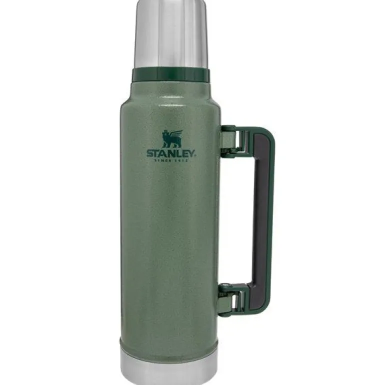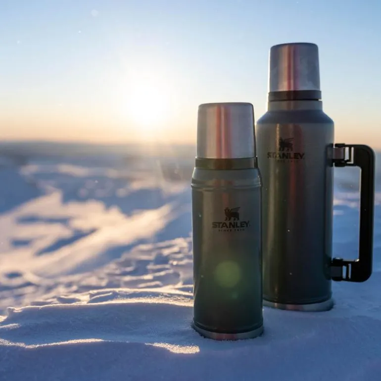 Dette er en solid, klassisk termos med praktisk skrukork fra Stanley. Termosen rommer 1 liter, og passer fint både på tur, skole og arbeid. Korken er lett å skru på, og er garantert lekkasjefri slik at du trygt kan ha den i sekken. Den medfølgende koppen er dobbeltisolert. Termosen holder innholdet varmt eller kaldt i 24 timer. Den kommer med et hendig håndtak, og den er lett å helle fra. Termosen er laget i kraftig rustfritt stål, og er naturlig BPA- fri.