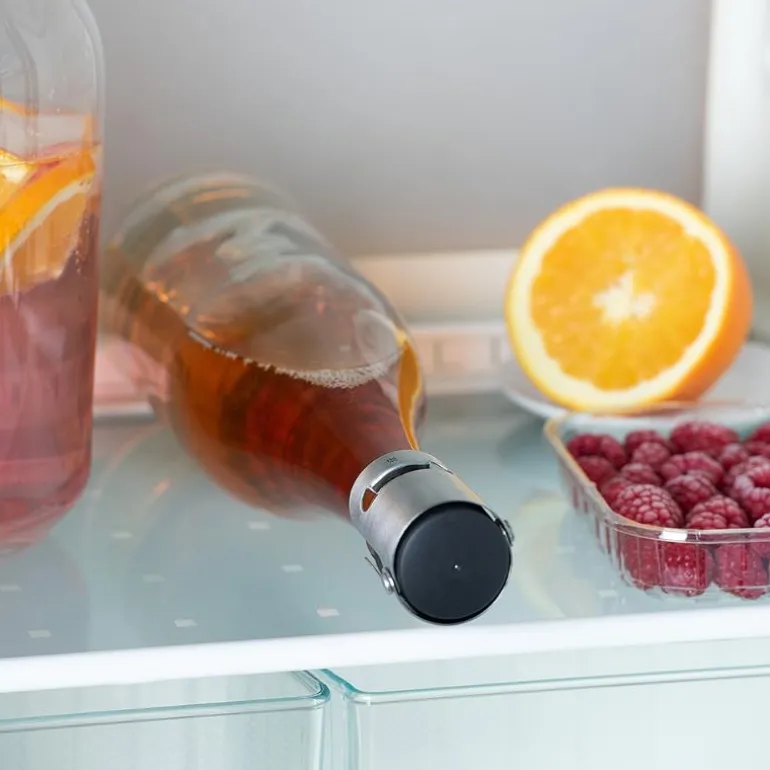 Champagnelukkeren er laget av matt Cromargan rustfritt stål 18/10 og er 5 cm høy. Diameteren på 4 cm betyr at den passer til alle flasker. Plasser Clever & More champagnelukker på flasken, og trykk ned de to vingene. Mekanismen gir dermed en helt lufttett lukking. Clever & More champagnelukker er fremstilt i kvalitetsmaterialer og er veldig enkel å bruke, derfor er den et populært tilbehør i enhver husholdning. Den holder mousserende vin og champagne frisk lenger.