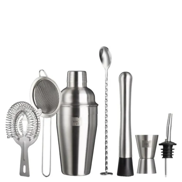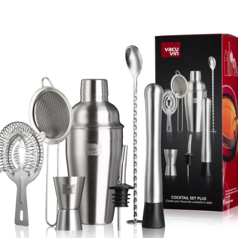 Vacu Vin’s Cocktailsett Plus er en komplett samling verktøy som er designet for den dedikerte hjemmebartenderen. Dette settet består av syv nøye utvalgte verktøy som gjør det mulig å blande og servere en rekke cocktailer og blandede drinker med profesjonell eleganse og presisjon, rett fra hjemmet ditt.