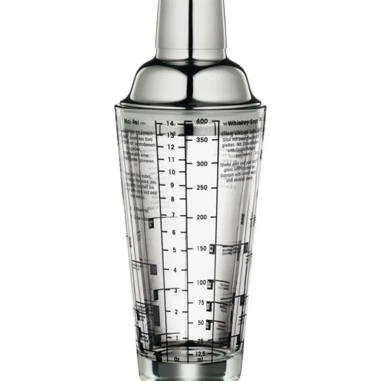 Cocktailshakeren har oppskrifter på 6 populære drinker på siden av glasset. Glasset kan ha 0,4L, toppen er tett og den integrerte silen hindrer frukt og urter i å søle ut.