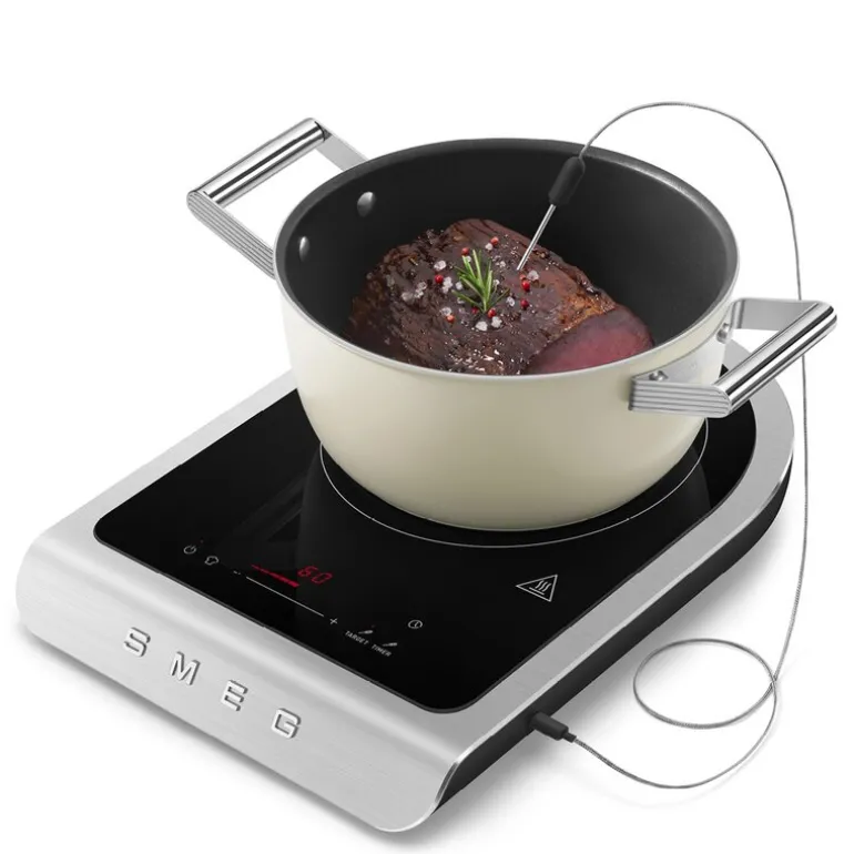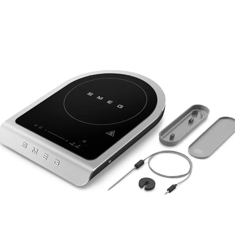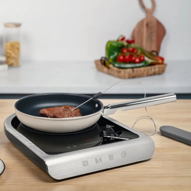 Collezione induksjonsplate 2100W PIC01 svart fra Smeg. Smeg Collezione induksjonsplate PIC01 kombinerer portabilitet med avansert teknologi, og løfter matlagingen til et profesjonelt nivå. Med en ekstern temperaturprobe for presisjonsmatlaging og automatiske programmer for grilling og steking, gir denne induksjonsplaten deg optimal kontroll over tilberedningen.