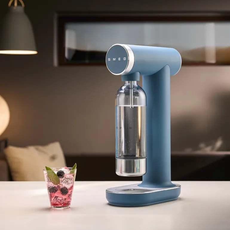 Collezione SKC01 storm blue kullsyremaskin fra Smeg gir deg muligheten til å lage kullsyreholdige drikker hjemme, akkurat slik du ønsker det. Den smarte dreieknappen lar deg enkelt justere kullsyrenivået etter smak – fra lett perlende til kraftig sprudlende. Maskinen fungerer med de fleste skrubare CO₂-sylindere (400–425 g / 60 l) og krever ingen installasjon. Det gjør det enkelt å komme i gang – fyll flasken, tilsett kullsyre og nyt en frisk og boblende drikke på sekunder.