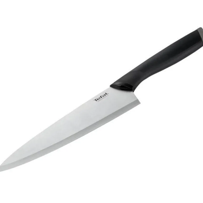 Tefal Comfort kokkekniv 20 cm. Tefal Comfort kokkekniv vil raskt bli en av dine mest betrodde hjelpere, klar til å håndtere enhver oppgave med presisjon og letthet. Comfort serien gir deg et komplett utvalg av høykvalitets kniver og tilbehør i rustfritt stål, utformet for å møte alle dine kulinariske behov. Det ergonomiske soft-touch håndtaket sikrer optimal komfort og kontroll under bruk, slik at du kan jobbe effektivt og trygt. Bladet, laget av førsteklasses rustfritt stål, gir enestående kutteevne og holdbarhet, noe som gjør det enkelt å hakke, kutte og skjære både grønnsaker og kjøttstykker.