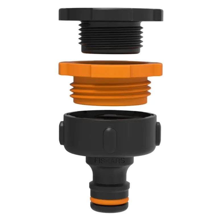 Comfort kranadapter multi 11,6 cm svart fra Fiskars. 3 forskjellige størrelser for å passe alle forskjellige utendørs kraner. Standardkobling – Kompatibel med andre produsenter.