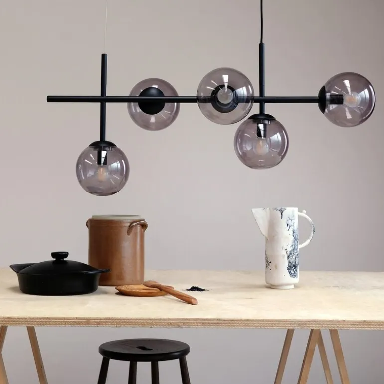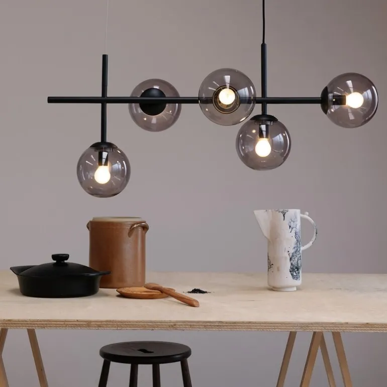Med sin lengde på 93 cm er Como pendel spesielt designet for langbord, spiseplasser eller større rom der den fungerer som et funksjonelt og dekorativt element. Lampen bruker E14-sokkel, og du kan velge pærer som gir den lysstyrken og fargetemperaturen som passer best til dine behov. De røykfargede glassene gjør det mulig å bruke kraftige lyspærer uten at lyset blir blendende. Lampen kan også kombineres med dimbare pærer, slik at du kan justere belysningen etter stemningen, enten det er til koselige middager, lekser eller rengjøring.