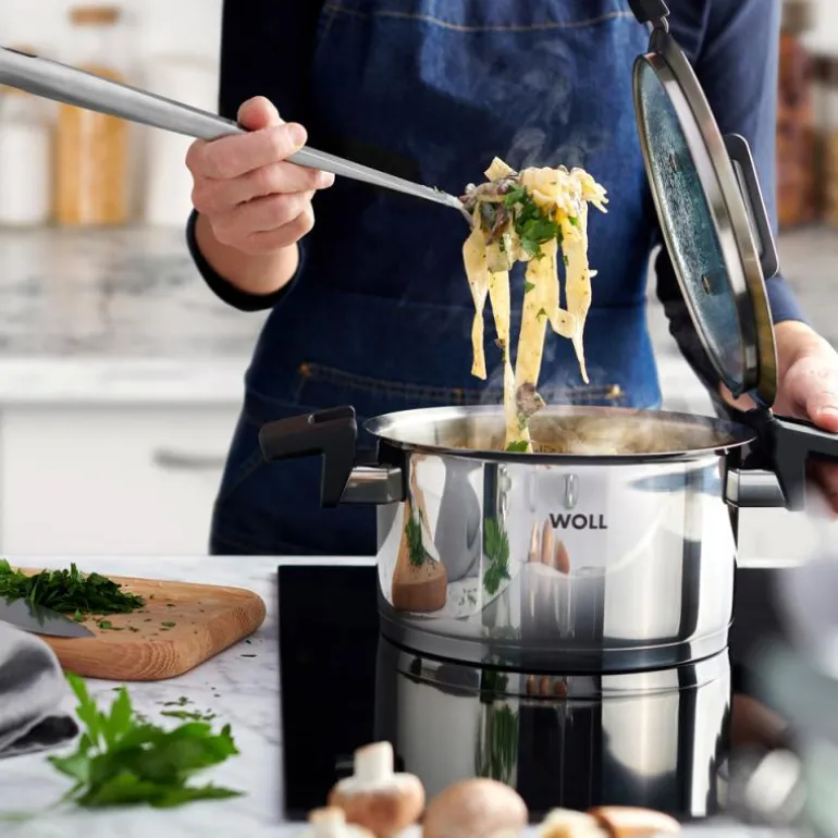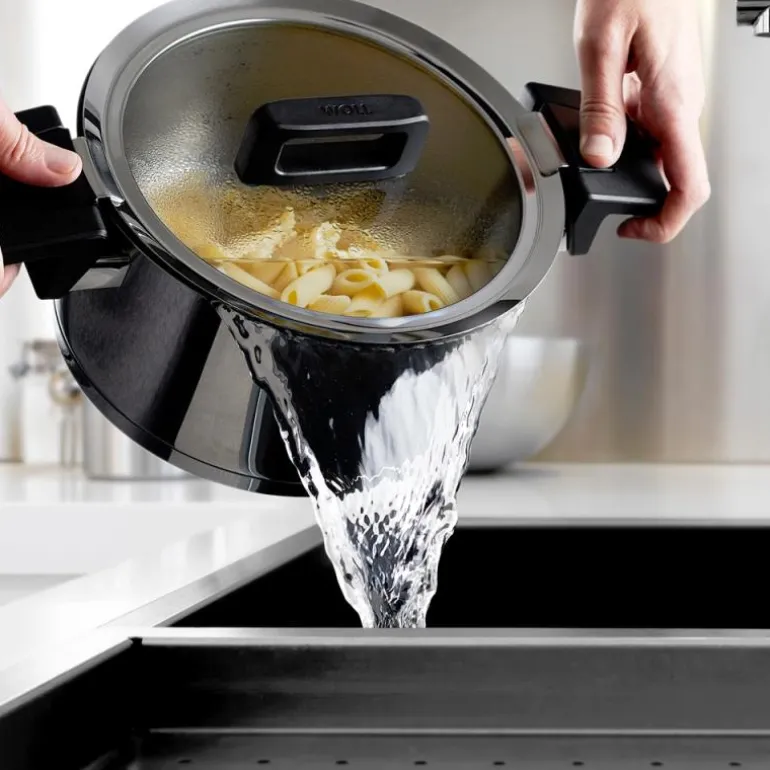 Gryten har et multifunksjonelt lokk for enkel helling og parkering av lokket og et praktisk litermål innvendig. Den kapslet bunn i stål med 5mm tykk aluminiums disk gjør at du får en optimal varmedistribusjon, passer til alle komfyrtopper også induksjon. Håndtakene er varmebestandig opp til 200C og tåler oppvaskmaskin.