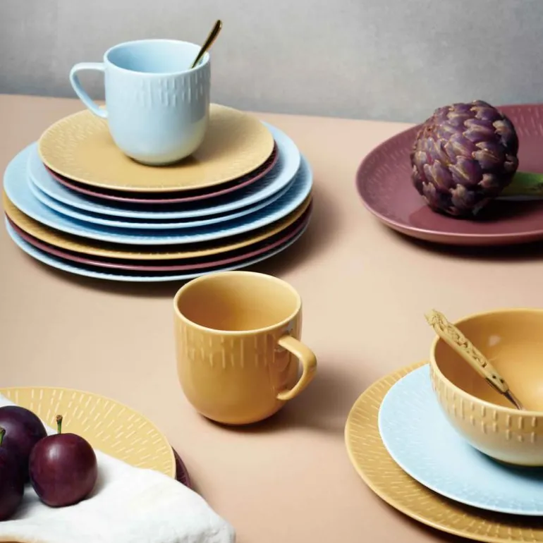 Serviset er laget av porselen som er brent ved over 1300 grader, og fargen er blandet inn i glasuren. Effekten av det er at porselenets fine hvite farge bryter gjennom relieffet, og skaper et lett, lekent og delikat uttrykk.