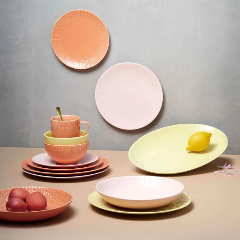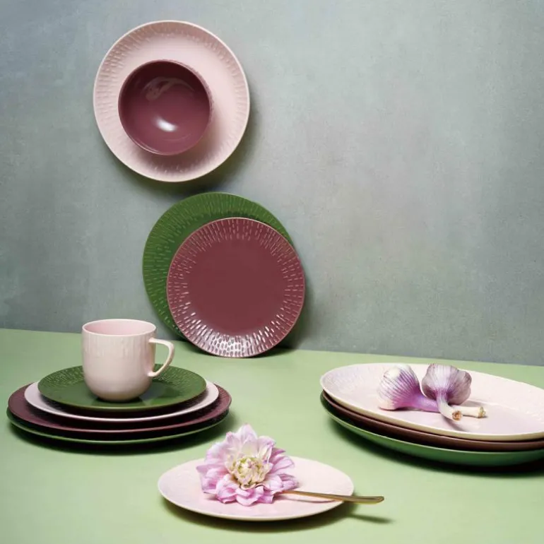 Serviset er laget av porselen som er brent ved over 1300 grader, og fargen er blandet inn i glasuren. Effekten av det er at porselenets fine hvite farge bryter gjennom relieffet, og skaper et lett, lekent og delikat uttrykk.