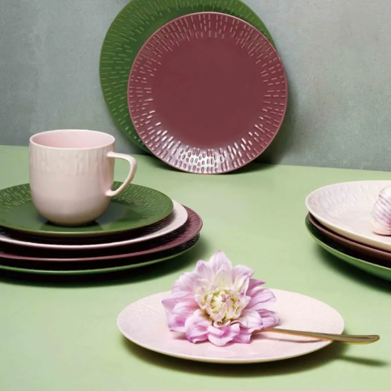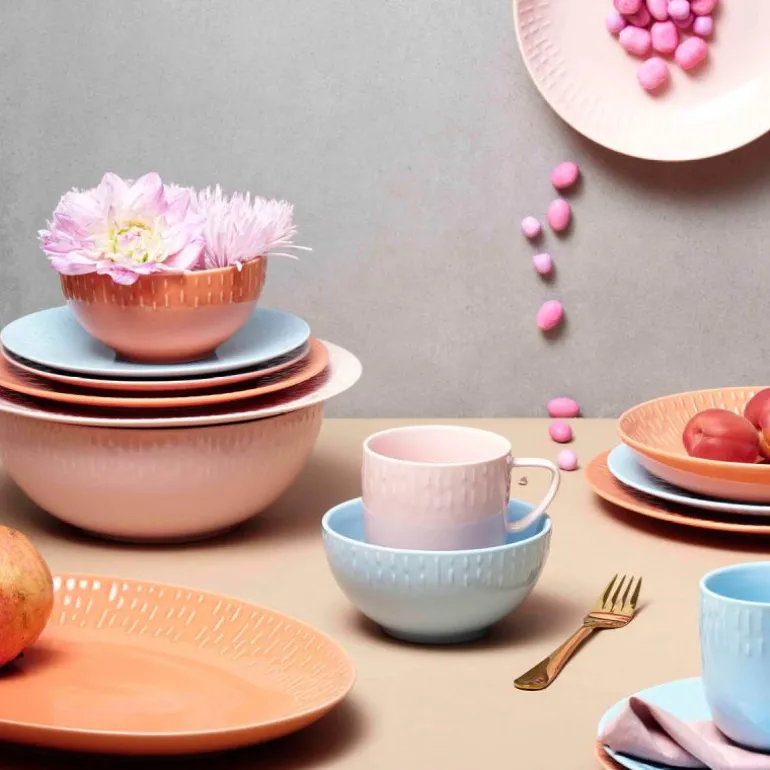 Serviset er laget av porselen som er brent ved over 1300 grader, og fargen er blandet inn i glasuren. Effekten av det er at porselenets fine hvite farge bryter gjennom relieffet, og skaper et lett, lekent og delikat uttrykk.