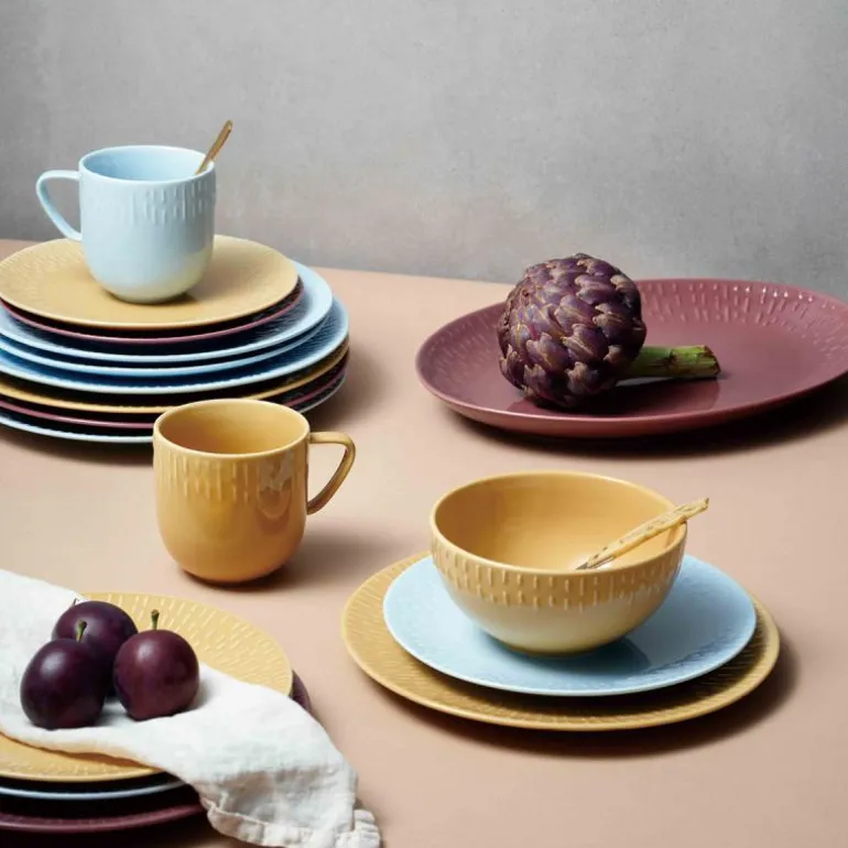 Serviset er laget av porselen som er brent ved over 1300 grader, og fargen er blandet inn i glasuren. Effekten av det er at porselenets fine hvite farge bryter gjennom relieffet, og skaper et lett, lekent og delikat uttrykk.
