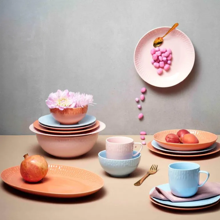 Serviset er laget av porselen som er brent ved over 1300 grader, og fargen er blandet inn i glasuren. Effekten av det er at porselenets fine hvite farge bryter gjennom relieffet, og skaper et lett, lekent og delikat uttrykk.