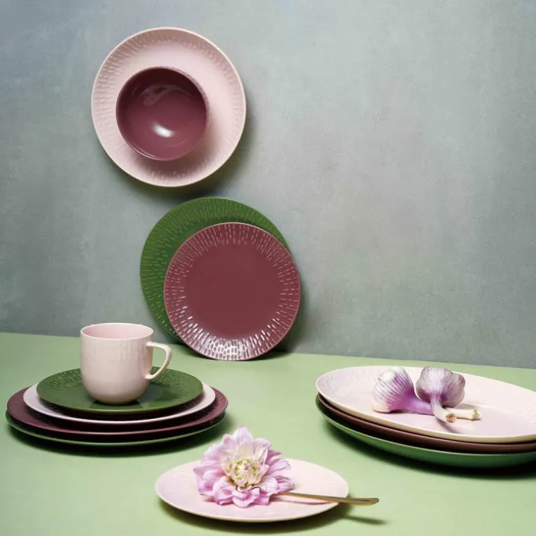 Serviset er laget av porselen som er brent ved over 1300 grader, og fargen er blandet inn i glasuren. Effekten av det er at porselenets fine hvite farge bryter gjennom relieffet, og skaper et lett, lekent og delikat uttrykk.