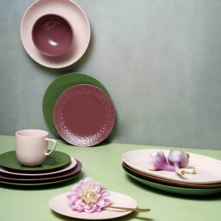 Serviset er laget av porselen som er brent ved over 1300 grader, og fargen er blandet inn i glasuren. Effekten av det er at porselenets fine hvite farge bryter gjennom relieffet, og skaper et lett, lekent og delikat uttrykk.