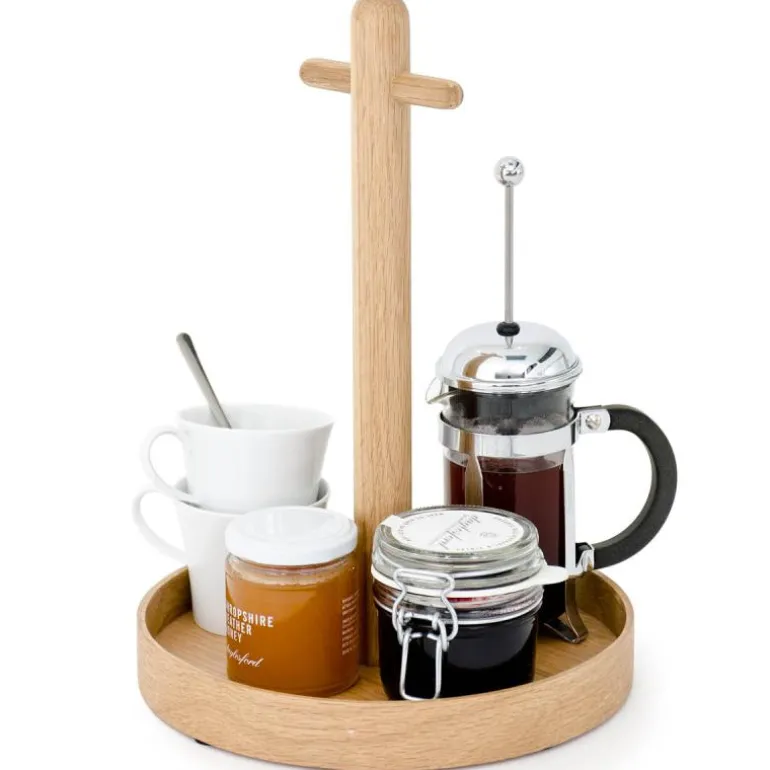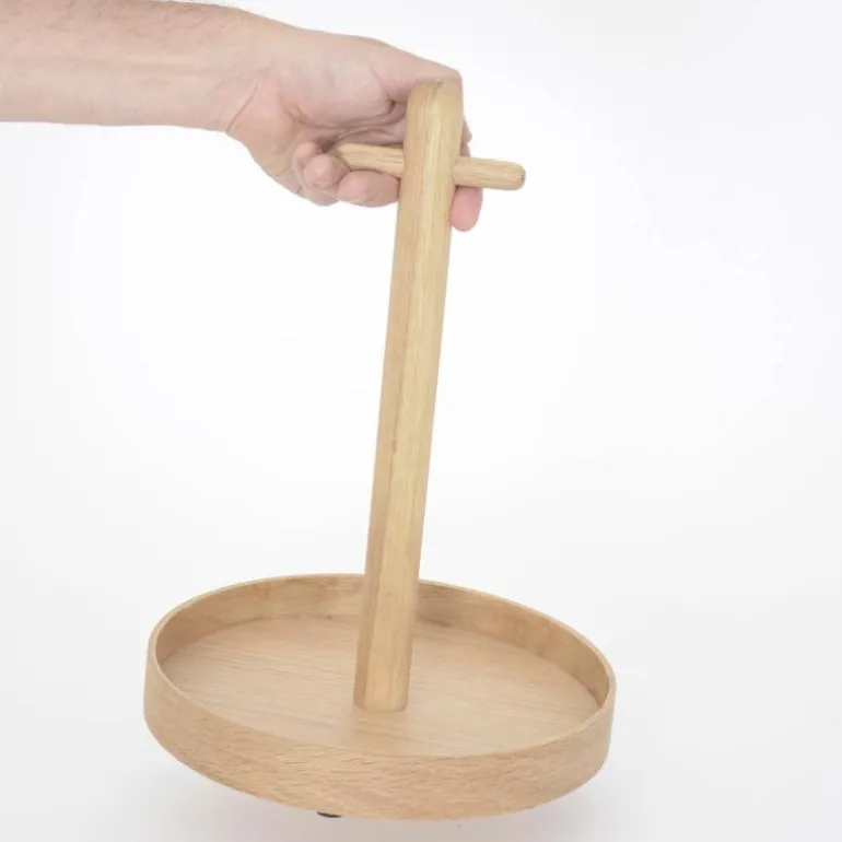 T-håndtaket gjør det enkelt å bære og eikekanten hindrer ting i å skli av. En lakkert finish beskytter eiken mot søl og flekker.