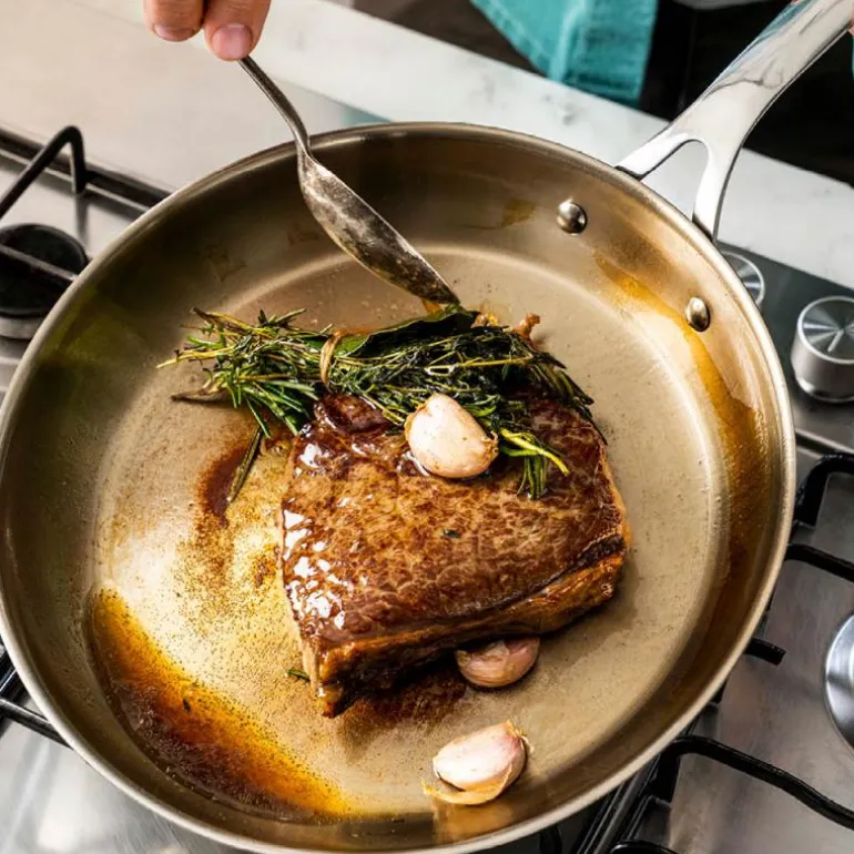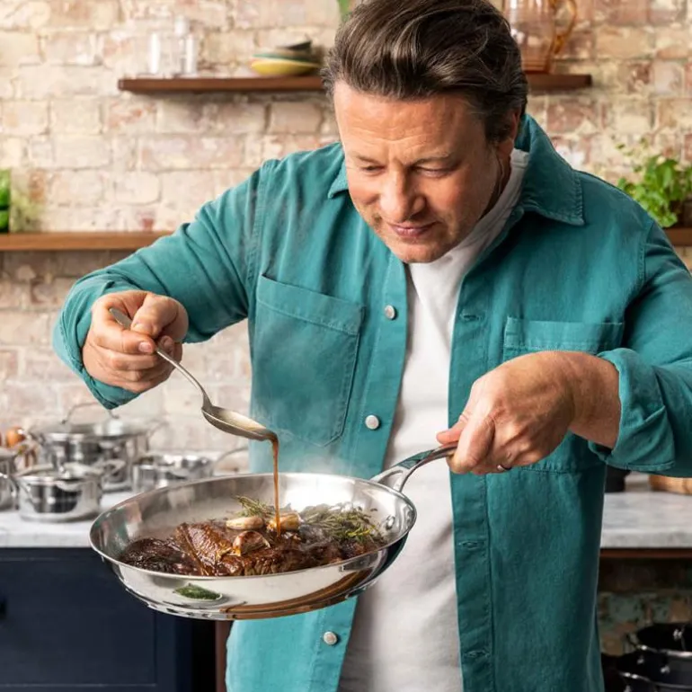 Stekepanne 24 cm uten belegg, fra Jamie Olivers Cook Smart serie Tefal. Jamie Olivers Cook Smart Jamie Olivers Cook Smart – en serie kvalitetsstekepanner av rustfritt stål for en restaurantlignende matlagingsopplevelse hjemme. Designet i samarbeid med Jamie Oliver: «Jeg elsker å lage mat med denne pannen. Det er alltid den jeg velger når jeg vil ha en deilig stekt biff. Trikset for å vite at den er klar til bruk, er å dryppe en dråpe vann i den. Når den danser som en perle over overflaten, er du klar til å begynne.»