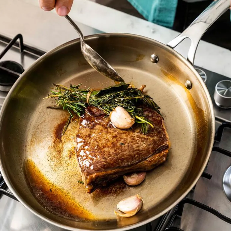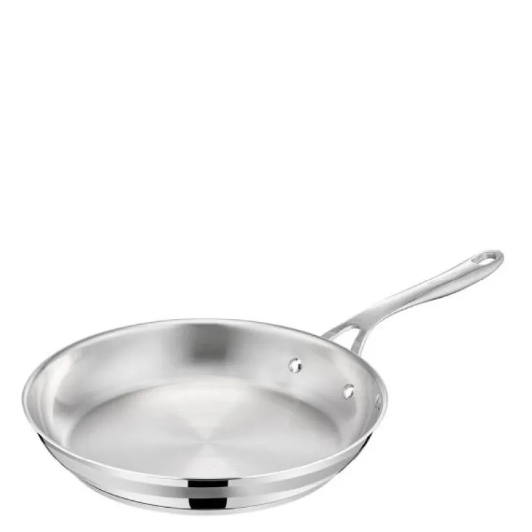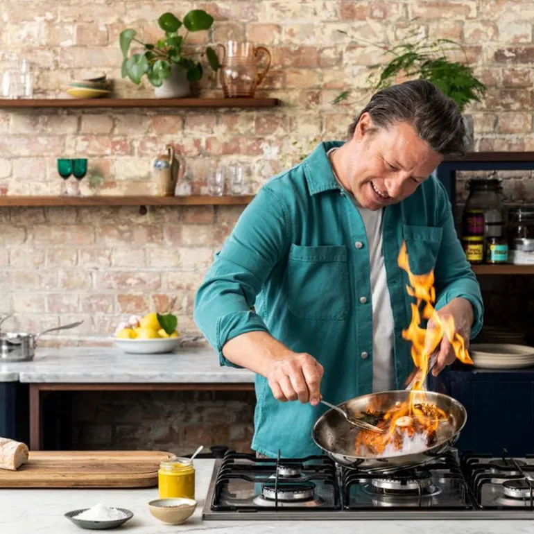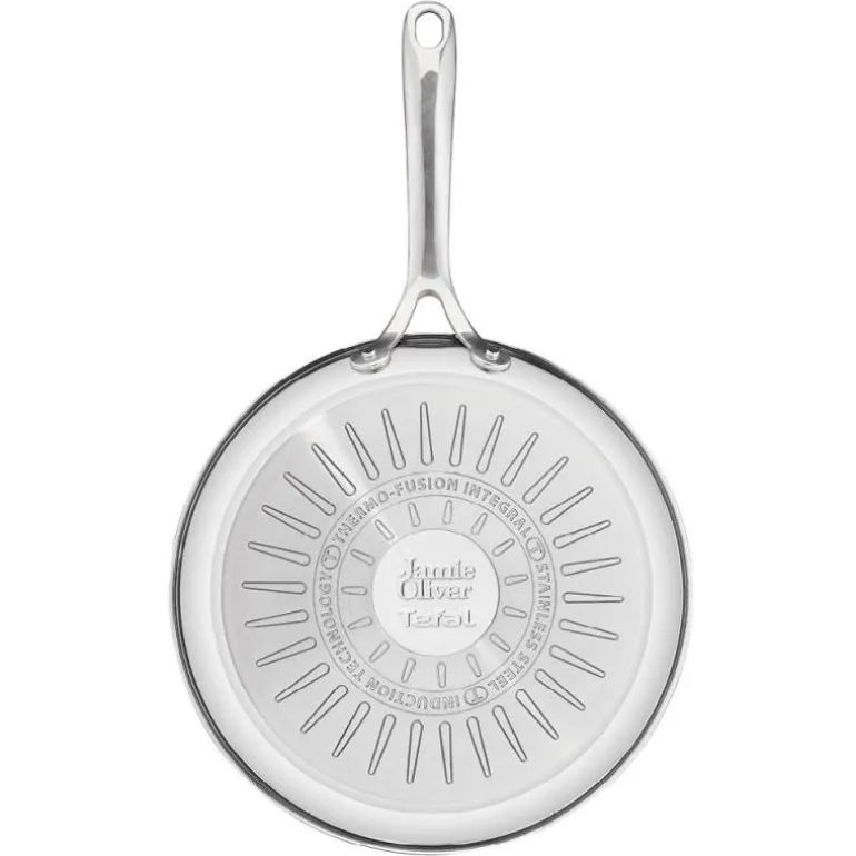 Stekepanne uten belegg, Cook Smart 28 cm fra Tefal. Jamie Olivers Cook Smart – en serie kvalitetsstekepanner av rustfritt stål for en restaurantlignende matlagingsopplevelse hjemme. Designet i samarbeid med Jamie Oliver: «Jeg elsker å lage mat med denne pannen. Det er alltid den jeg velger når jeg vil ha en vakkert stekt biff. Trikset for å vite at den er klar til bruk, er å dryppe en dråpe vann i den. Når den danser som en perle over overflaten, er du klar til å begynne.»