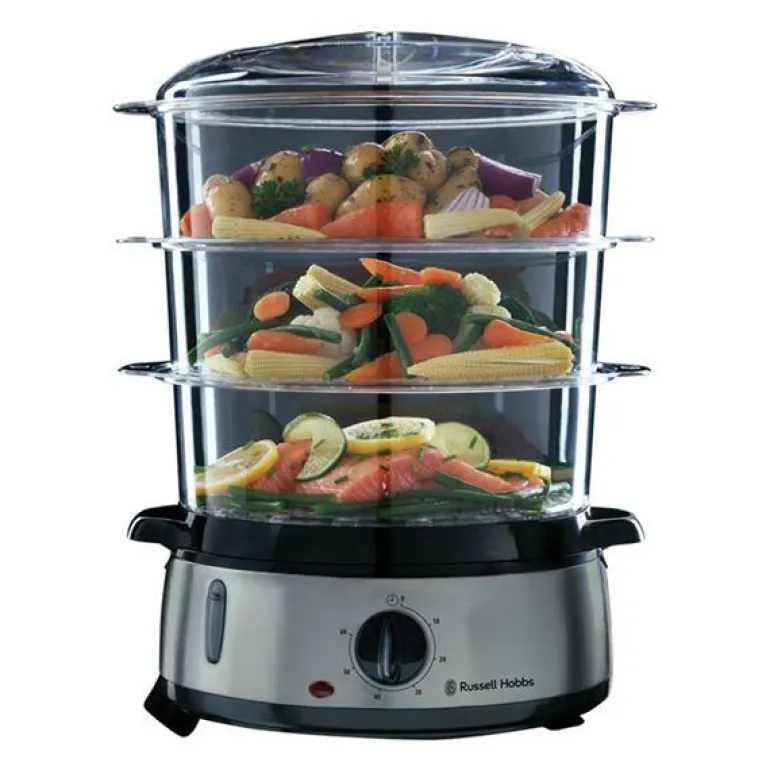 Cook@Home dampkoker fra Russell Hobbs er den ideelle løsningen for sunn og enkel matlaging. Med en kraftig 800W motor og tre separate hyller, kan du tilberede ulike typer mat samtidig, som ris, grønnsaker og fisk, og beholde maksimal mengde av næringsstoffer og vitaminer. Den smarte designen gjør det enkelt å lage smakfulle og næringsrike måltider uten bruk av fett, noe som passer perfekt for en sunn livsstil.