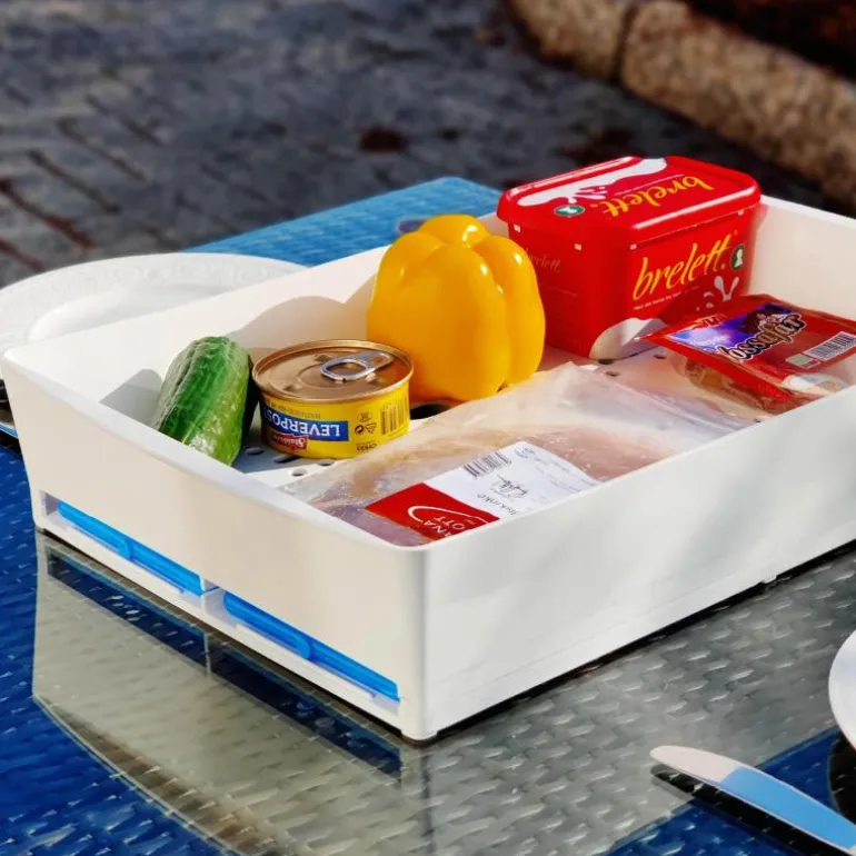 Hold orden på maten i kjøleskapet samtidig som du kan nyte lange måltider uten å tenke på at osten og smøret blir mykt. Cooltray er et serveringsbrett som passer perfekt inn i kjøleskapet. Putt fryseelementene inn i brettet før du setter maten på bordet for å holde maten kjølig og frisk lenge.Cooltray er en norsk oppfinnelse som er utformet slik at kulden fra fryseelementene spres jevnt igjennom hullene i bunnen og holder maten frisk og kjølig. Når du skal bruke brettet tar du fryseelementene ut av fryseren og setter de inn i åpningen på sidene. Etter endt måltid legger du fryseelementene tilbake i fryseren og setter brettet med alt pålegg inn i kjøleskapet. Dette gir deg mulighet til enkelt å ta alt favorittpålegg inn og ut av kjøleskapet i en operasjon. Ganske enkelt genialt.Med Cooltray får du:et ryddig kjøleskapenkel tilgang til favorittpåleggetpålegg som ikke ødelegges av varmen i rommet eller ute i solamindre matsvinnet brett som fungerer til alle anledninger