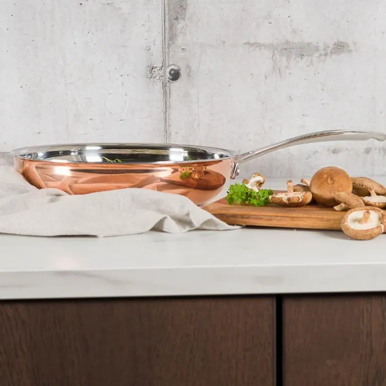 Sabor Copper stekepanne med en diameter på 28 cm kombinerer tidløs design med profesjonell funksjonalitet. Den 3-lags konstruksjonen av kobber, aluminium og stål gir enestående varmeledning, noe som sikrer jevn temperaturfordeling for perfekte resultater. Den store størrelsen gjør pannen ideell for større porsjoner, enten du skal steke, sautere eller tilberede retter som krever presisjon.