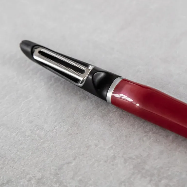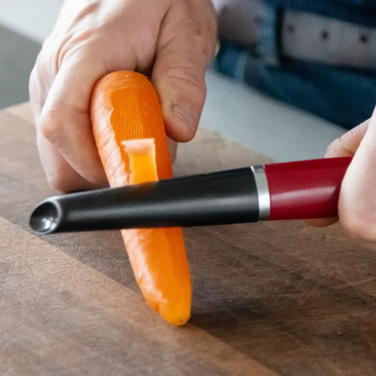 KitchenAid Core grønnsaksskreller i empire red gjør skrelling av frukt og grønnsaker enkelt. Skrelleren har et dobbeltkantet, serratert blad i slitesterkt rustfritt stål og et ergonomisk håndtak som gir et komfortabelt og sikkert grep. Håndtaket har en blank finish med preget logo og satinkrom-detaljer. Skrelleren tåler oppvaskmaskin og leveres med et beskyttende hylster for trygg oppbevaring.