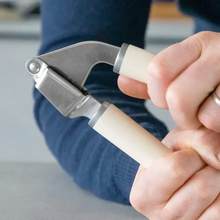 KitchenAid Core hvitløkspresse i fargen almond cream, gjør det enkelt å knuse hvitløk og sjalottløk, og den er utformet med et hullmønster som maksimerer mengden som presses ut. Laget av robust rustfritt stål, har hvitløkspressen et ergonomisk håndtak med blank finish, preget logo og kromdetaljer. Det romslige kammeret har plass til flere hvitløksfedd om gangen, noe som gjør den rask og effektiv. Tåler oppvaskmaskin for enkel rengjøring.