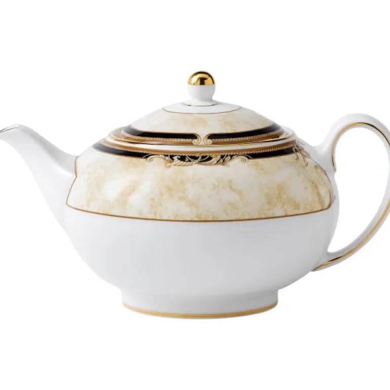 Cornucopia Teapot 1.4pt. Unn deg rikdommen til det mytiske overflodshornet med Cornucopia, utsmykket med legendariske skapninger som enhjørninger og satyrer for å skape et mønster som passer for den greske myten. Kolleksjonen er dekorert med vakre bånd av elfenbenspergament, mørke marinebånd, okerfarget kant og en skinnende 22 karat gullkant – alt dyktig dekorert på silkehvitt, fint benporselen.