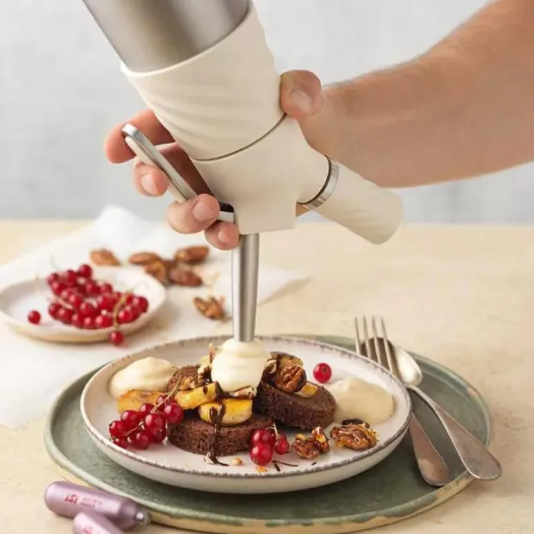 Takket være iSi’s avanserte teknologi er det en lek å skape luftige mousser, deilige toppinger, kremet pisket krem, fristende bakverk og uimotståelige sauser – alt med et knappetrykk. Sifonen egner seg kun for kald bruk.