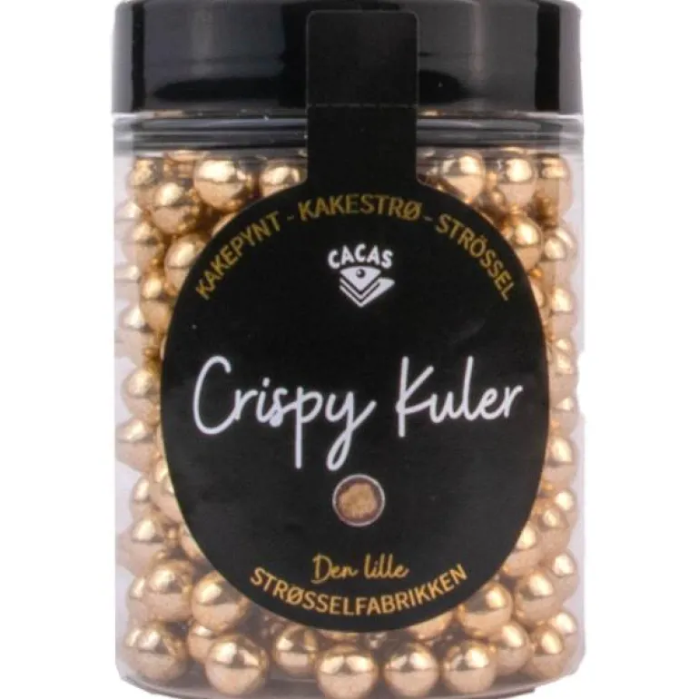 Kakestrøssel fra Cacas, crispy gullkuler. Pynt opp dine bakverk med disse lekre crispy kulene fra Cacas. Kulene har et senter av cornflakes og melkesjokolade, belagt med et tynt lag sukker og gullfarge. Disse sprø kulene er godt egnet til å brukes som dekorasjon på kaker og alle slags bakverk, eller bare til pynt til enhver anledning eller fest. De er dekorative og smaker veldig godt.