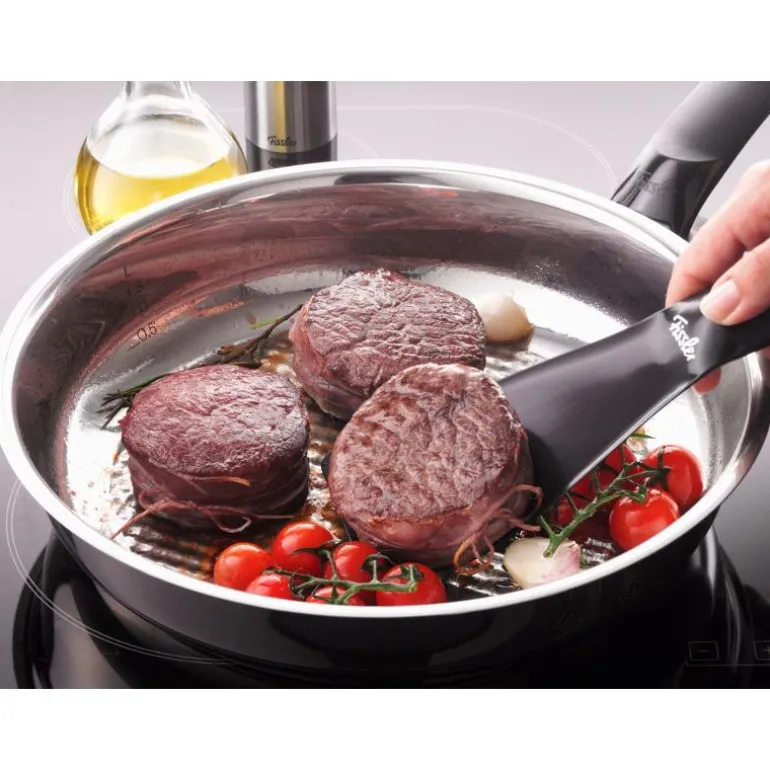 En omelett er ikke en biff! Dette forklarer enkelt hvorfor enhver husholdning behøver to typer panner: En belagt panne for mat som krever et non-stick belegg, som for eksempel egg eller fisk, og en stålpanne for mat som krever steking på veldig høy varme, som for eksempel biff. Dette er en panne for HØY temperatur spesielt godt egnet til å steke biff: Crispy Steelux stekepanne i rustfritt stål.Fissler har utviklet den perfekte stekepanne for biff og annet mat som krever ekstra høy temperatur, noe som er nødvendig for å skape en «Maillardreaksjon» som gir en god stekeskorpe og karamellisering. Med den unike Novogrill-overflaten vil du oppleve å få en perfekt stekeskorpe med mindre fett. Den vaffelformede overflaten sørger for at biffen blir liggende over oljen/fettet, på samme måte som på en grill. Pannen har i tillegg praktiske funksjoner som hellekant, innvendig litermål og et håndtak som forblir kjølig. For å skape den gode smaken er det viktig med en god panne med tykk bunn. Det gir en god varmefordeling. CookStar base i bunnen av pannen sikrer jevn distribusjon av varme i pannen og sørger for at bunnen vil holde seg helt flat selv etter mange års bruk. Crispy Steelux fås i 20cm, 24cm og 28cm diameter.Fissler har 175-års erfaring som grytemaker og er en av verdens ledende produsenter av utstyr til koking og steking. produktene produseres i Tyskland med . Fissler Siden 1845 har Fissler produsert produkter av uovertruffen kvalitet og holdbarhet på sin fabrikk i Idar-Oberstein i Tyskland.