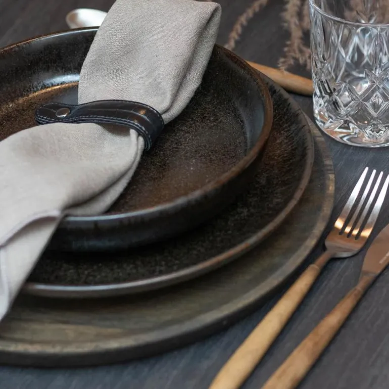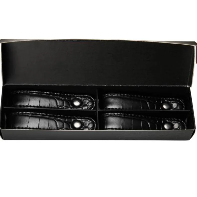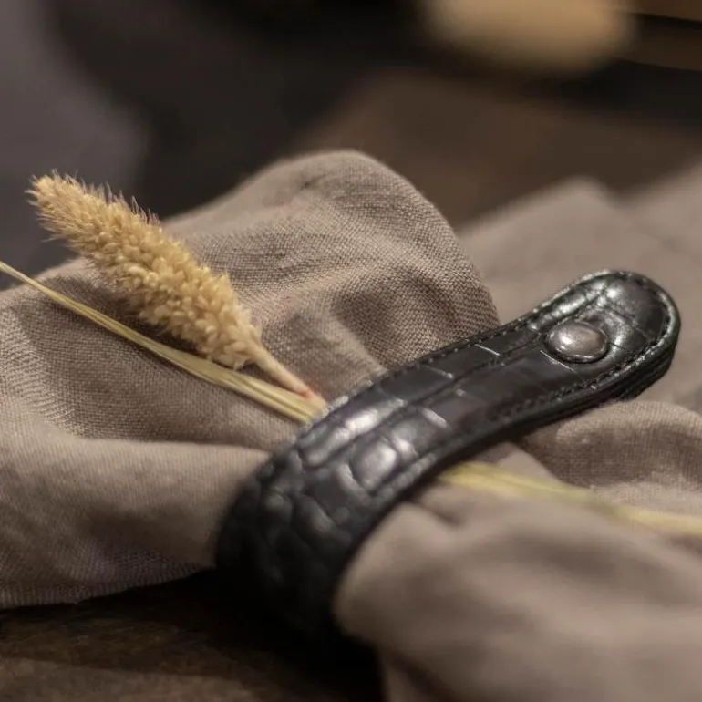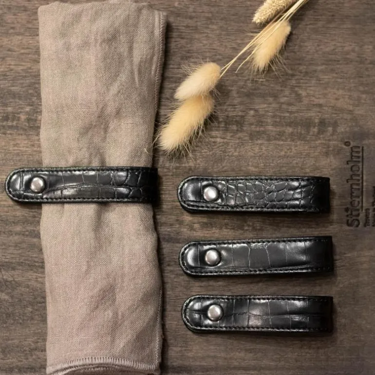 Stiernholm Croco serviettringer i matt sort krokodillepreget kunstskinn (PU). Serviettringene har gunmetal farget trykknapp og en fin sømdetalj mot kanten av ringen. Serviettringen har en litt oval fasong og er meget dekorativ. Passer til både papir og stoffservietter.