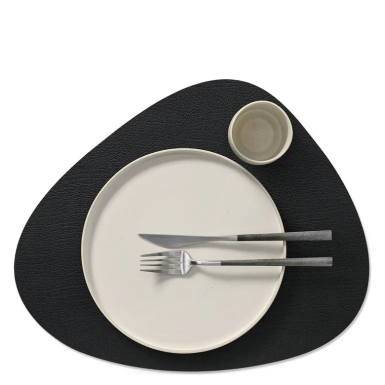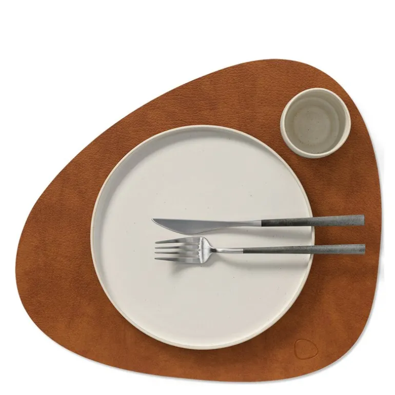Curve Bull brikke tosidig cognac/svart. TABLE MAT DOUBLE CURVE er LIND DNAs mest allsidige spisebrikke – en tosidet spisebrikke laget av OEKO-TEX®-sertifisert resirkulert skinn med forskjellige farger og overflater på hver side.