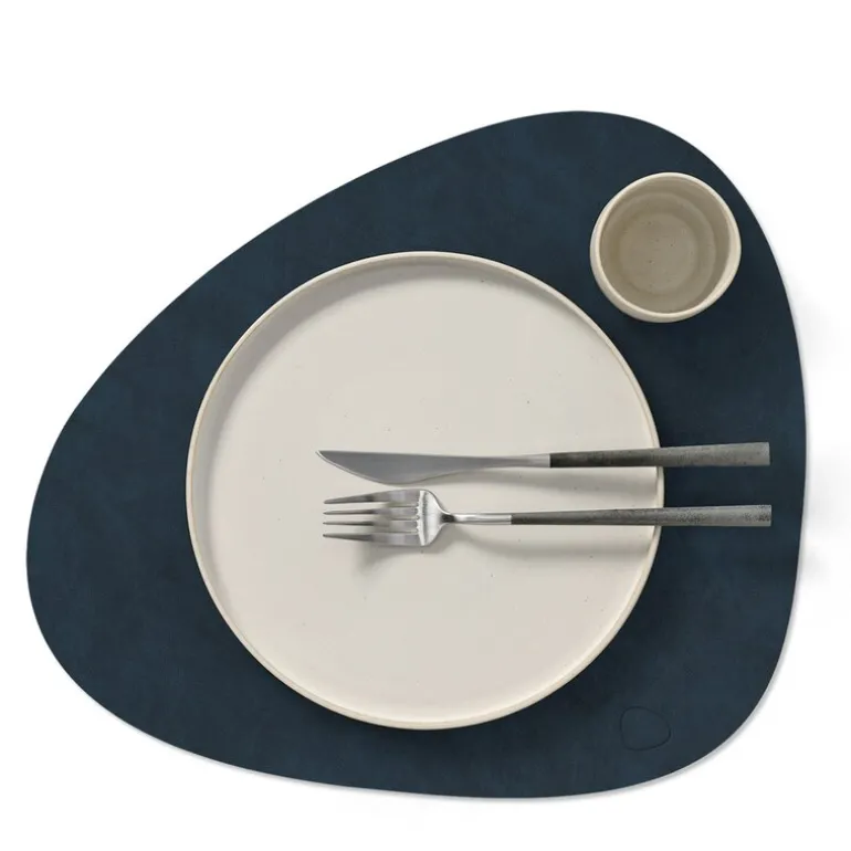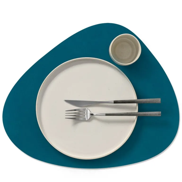 Curve Nupo brikke tosidig blå/petrol. TABLE MAT DOUBLE CURVE fra LIND DNA er en funksjonell og stilfull spisebrikke, designet for maksimal fleksibilitet. Denne tosidige spisebrikken er laget av OEKO-TEX®-sertifisert resirkulert skinn, og har ulike farger og overflater på hver side, noe som gjør det enkelt å endre utseendet på bordet ved å snu den.