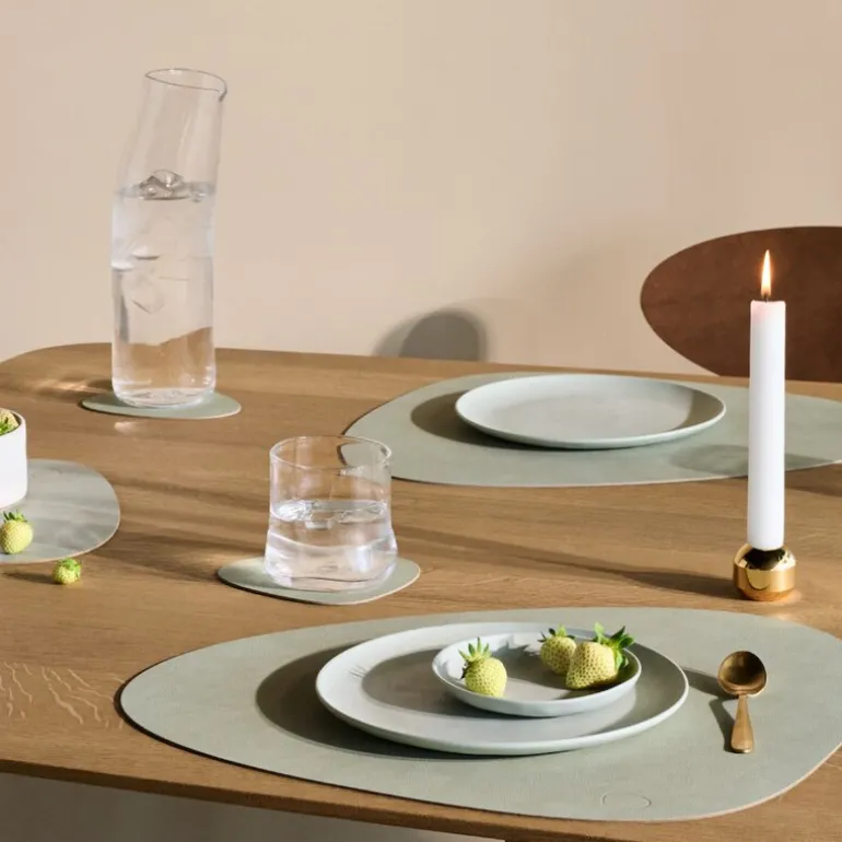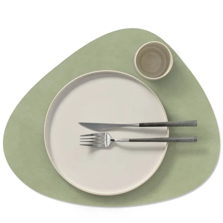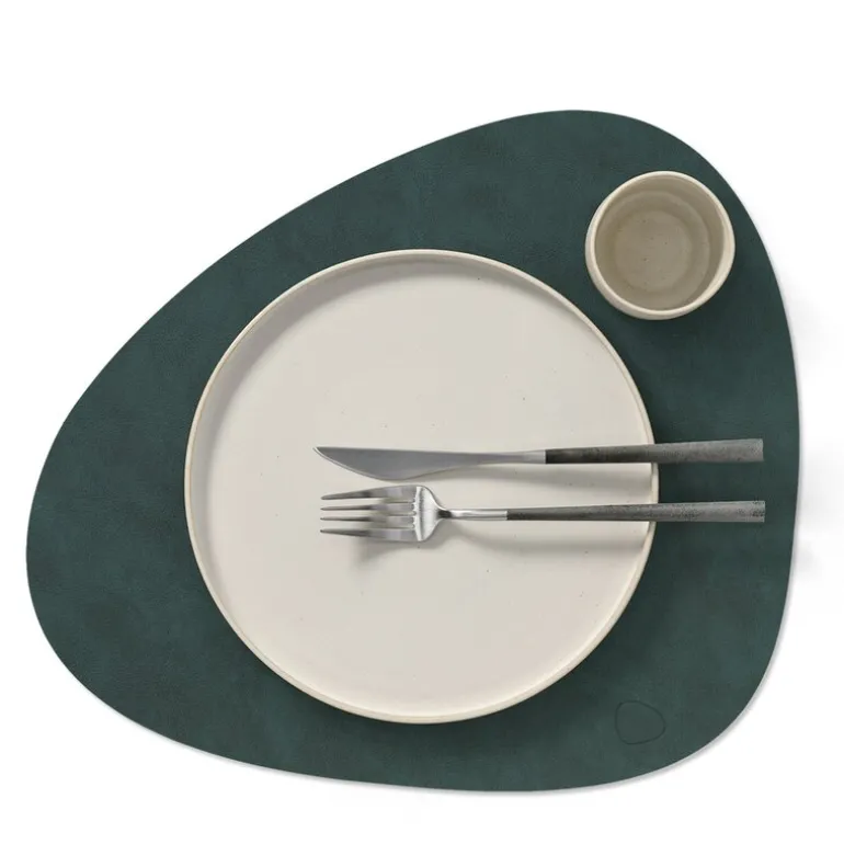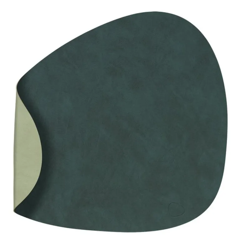 Curve Nupo brikke tosidig mørk grønn/olivengrønn. TABLE MAT DOUBLE CURVE fra LIND DNA er en funksjonell og stilfull spisebrikke, designet for maksimal fleksibilitet. Denne tosidige spisebrikken er laget av OEKO-TEX®-sertifisert resirkulert skinn, og har ulike farger og overflater på hver side, noe som gjør det enkelt å endre utseendet på bordet ved å snu den.